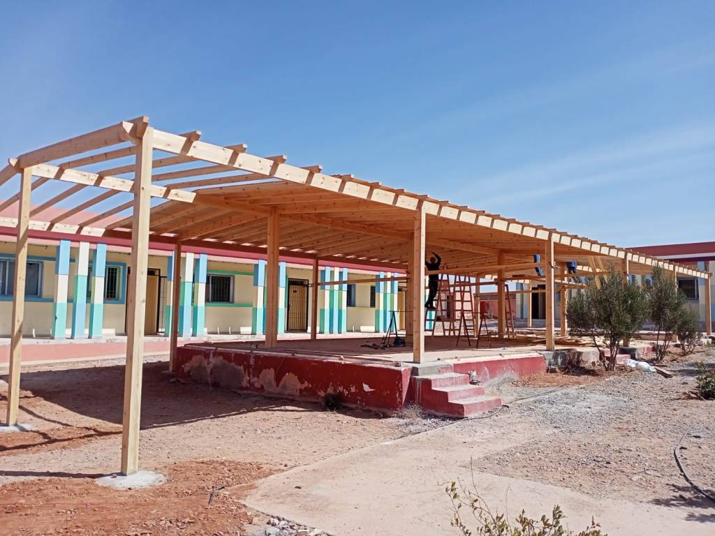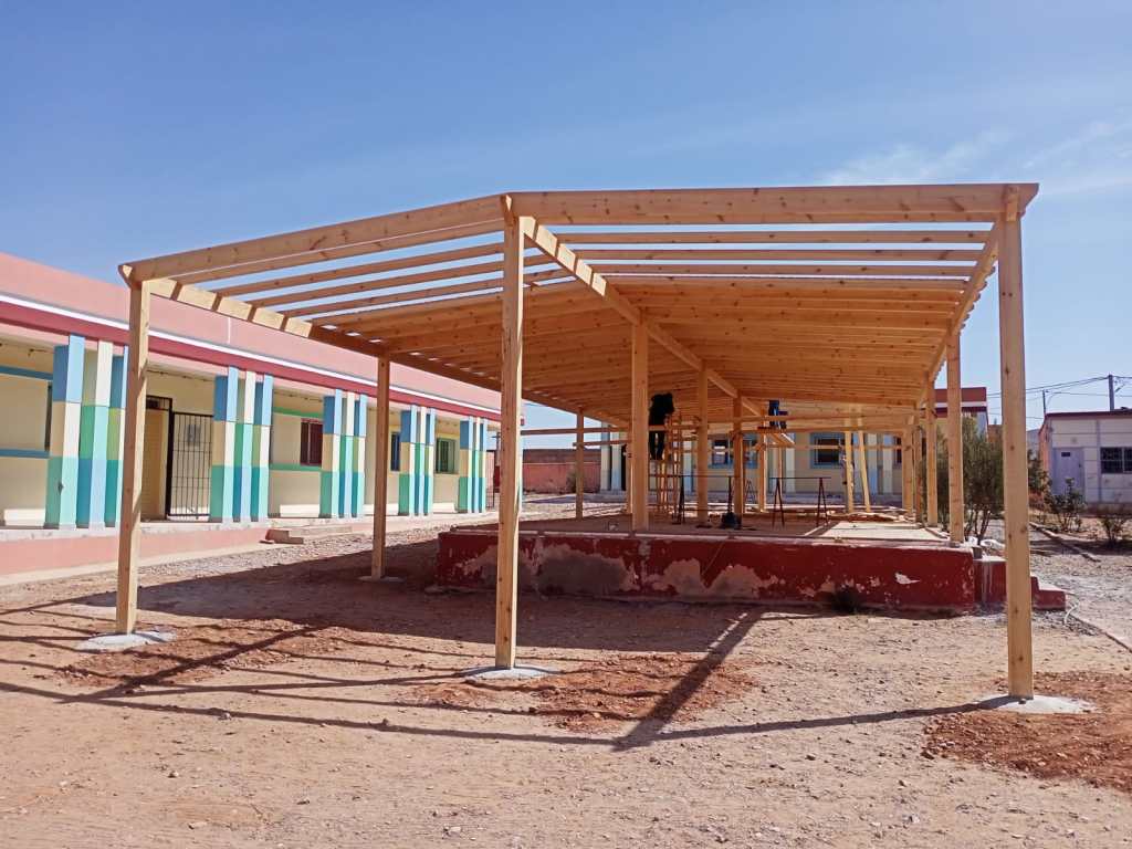 Construction d’un préau au tout début de l’année 2024. Les enfants peuvent maintenant s’abriter de la pluie ou du soleil pendant leurs récréations / activités extérieures.